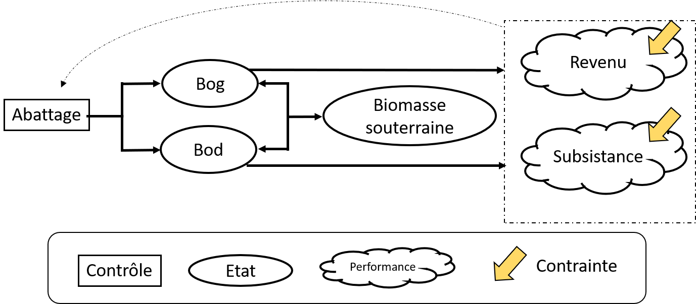 Ce modèle représente l’effet du pâturage de troupeaux plurispécifiques sur la ressource alimentaire ainsi que ces effets sur le revenu et la capacité d’autosubsistance des éleveurs. Du fait de la nature très extensive des troupeaux considérés, seul un contrôle correspondant à l’abattage des animaux permet de réguler le troupeau (pas de gestion de la reproduction ni d’affouragement).